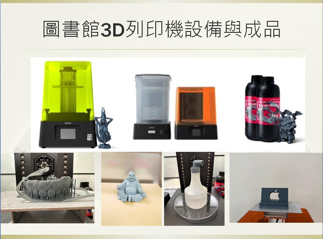 2.圖書館現有3D列印機、及灰色樹脂耗材,歡迎自行備圖到圖書館列印。設備及印出成品參見下圖。