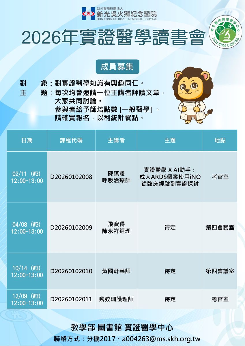 【實證醫學中心】2026年實證醫學讀書會開始囉,成員募集,歡迎報名。