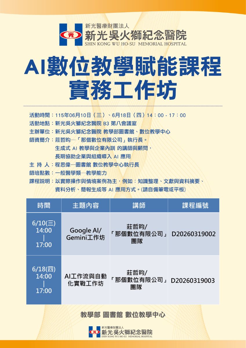 ※ AI數位教學賦能課程實務工作坊,歡迎各科、各職類臨床教師、有興趣同仁報名參加。